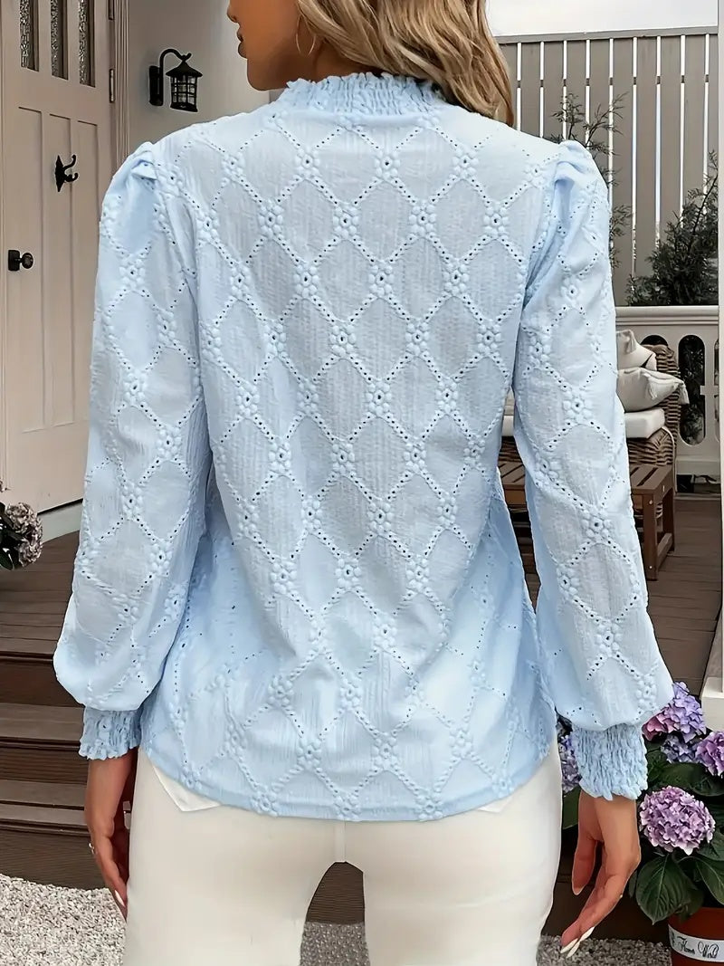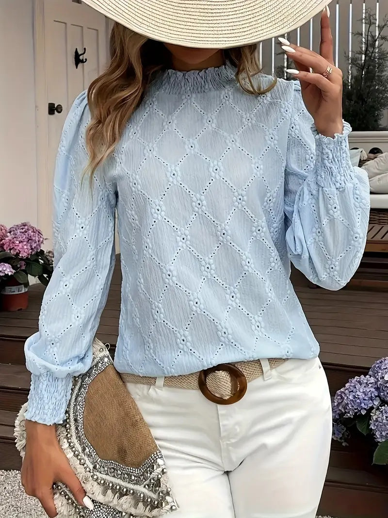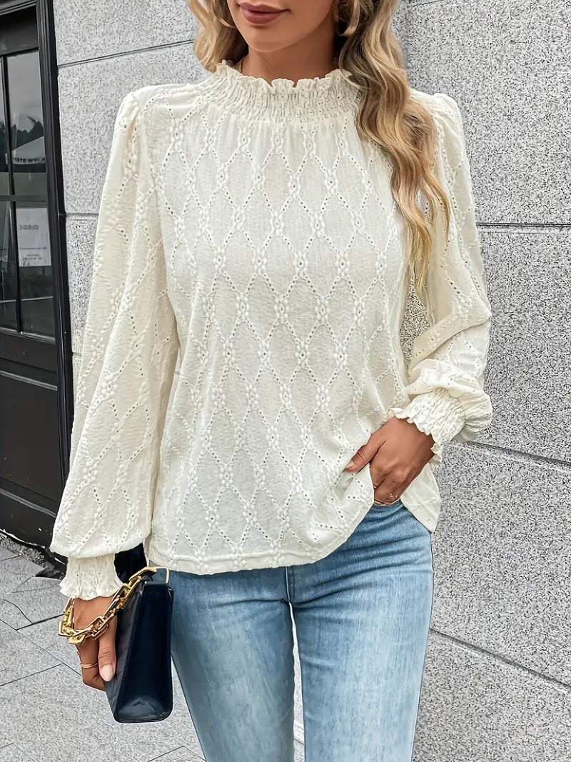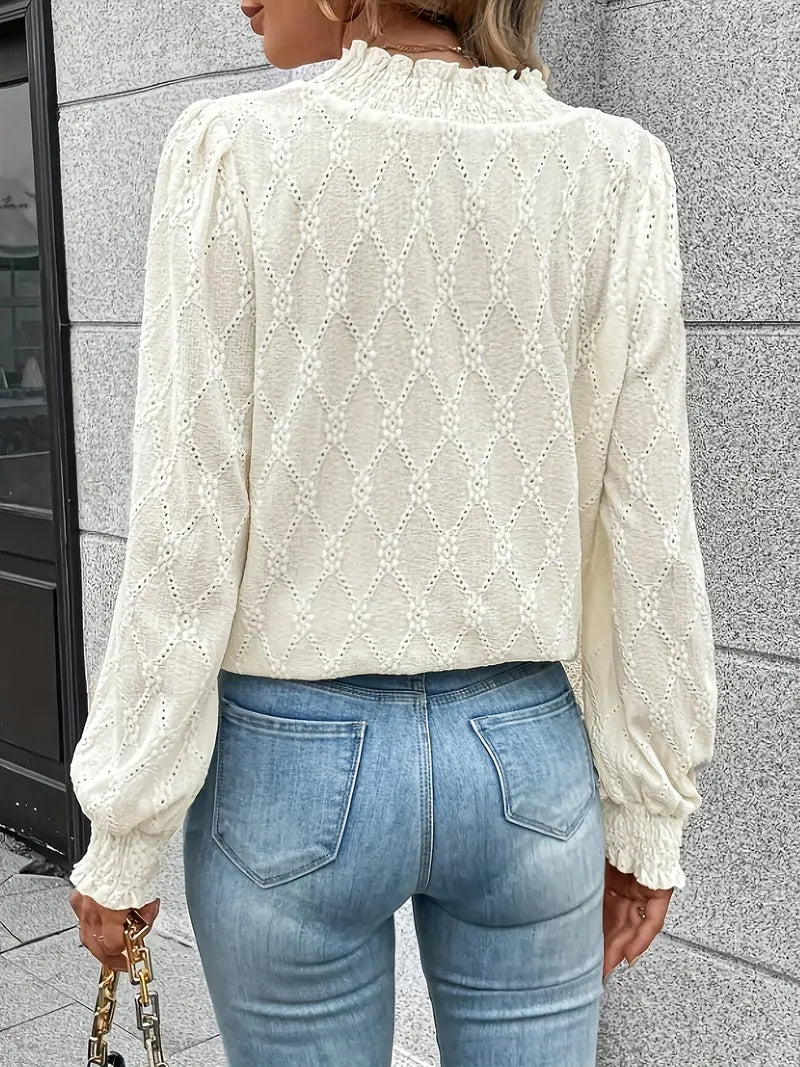 • Design: Features a chic mock neck, long sleeves with ruffled cuffs, and an elegant diamond pattern for a timeless touch.