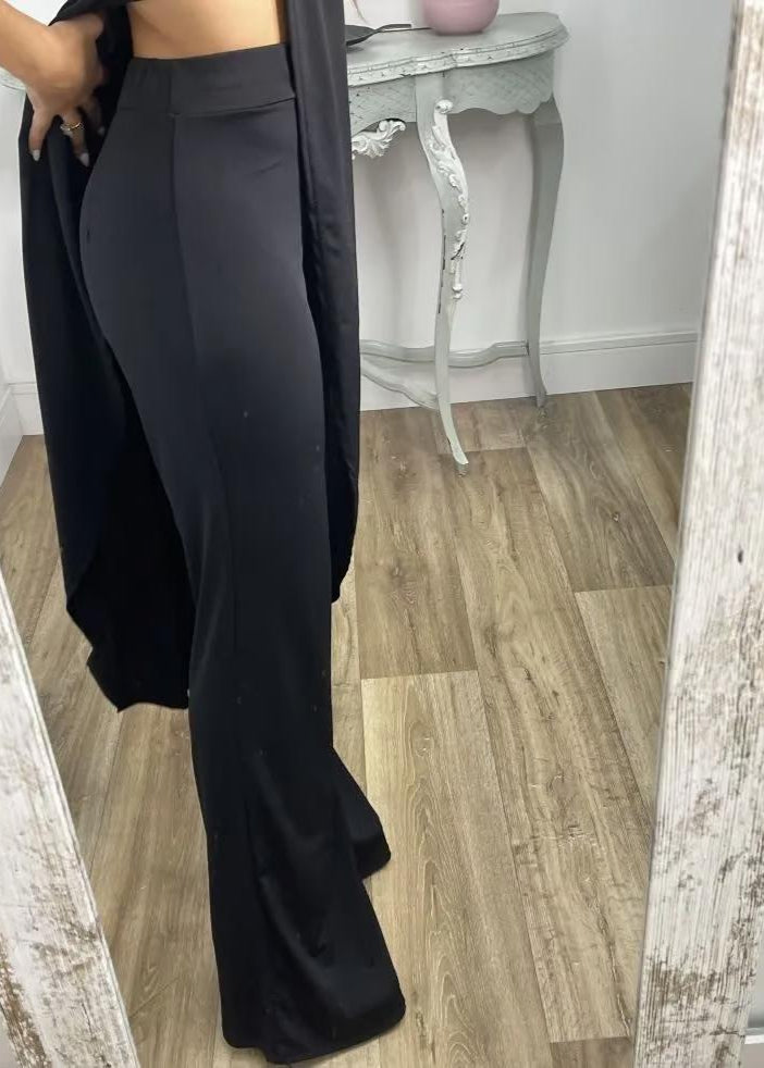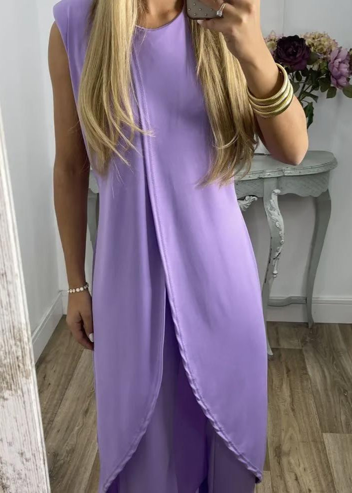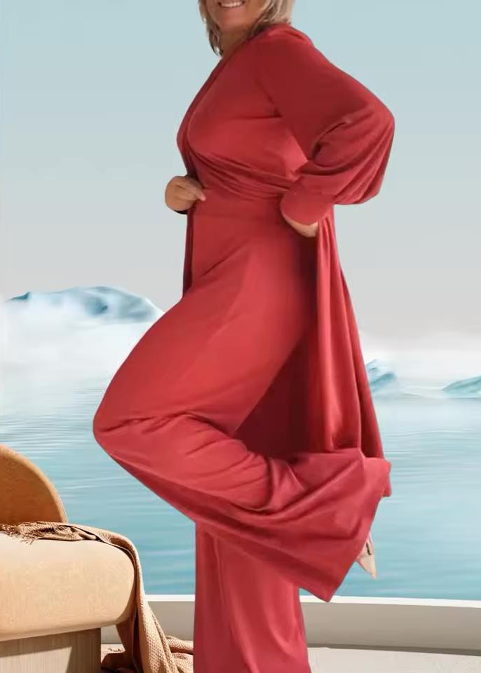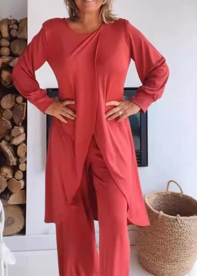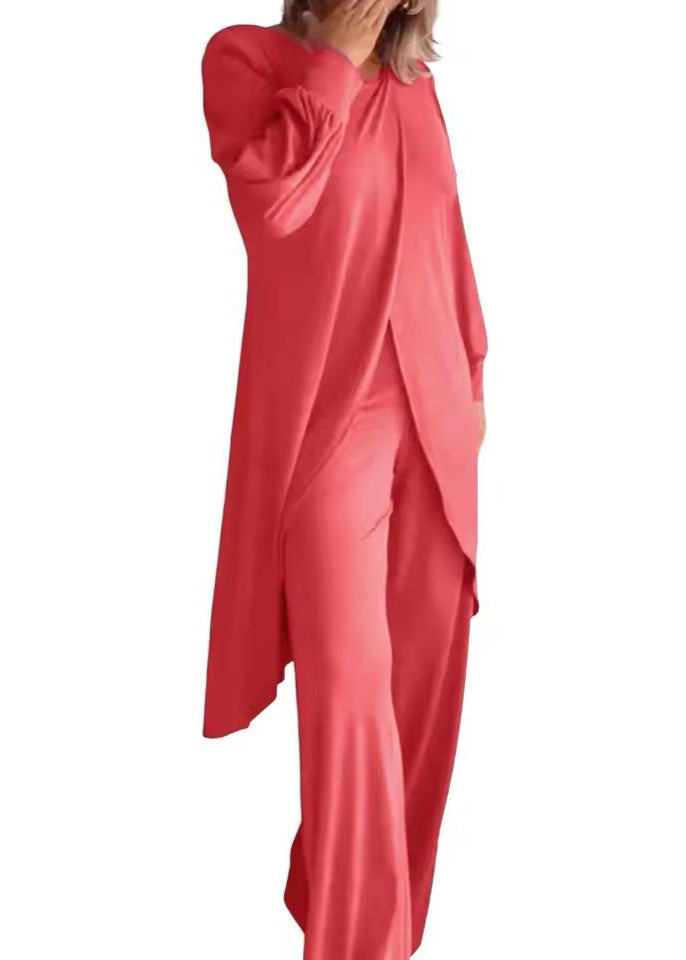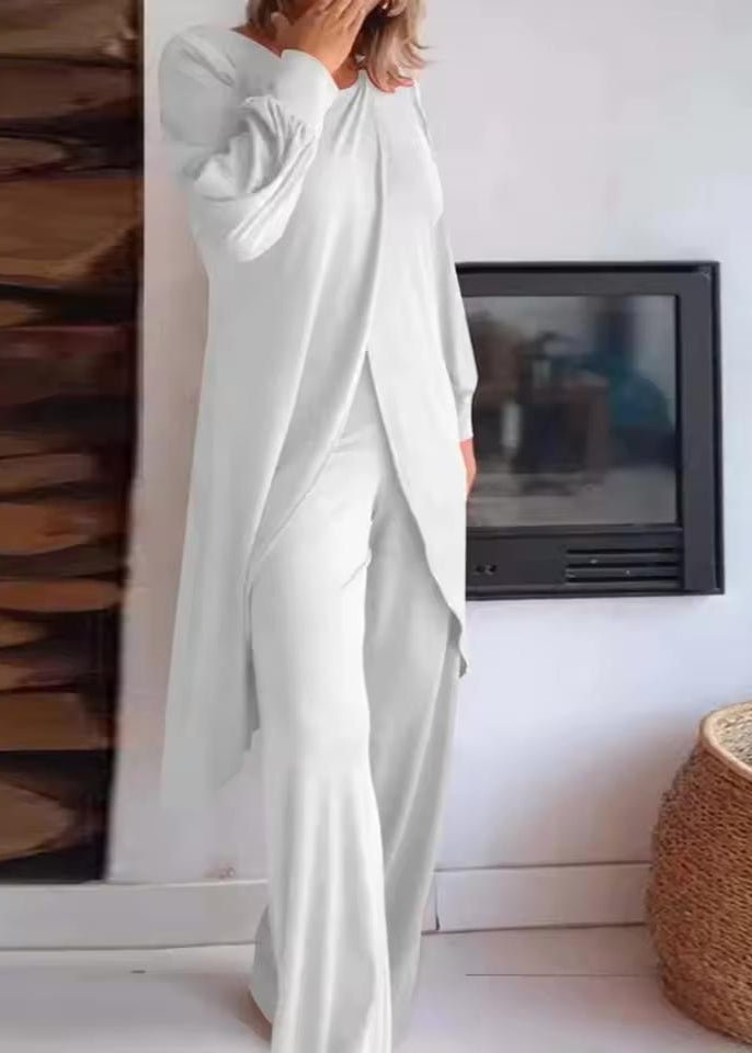 - Design: Features a long-sleeve blouse with an elegant asymmetrical hem, paired with flowy wide-leg pants for a refined yet relaxed silhouette.